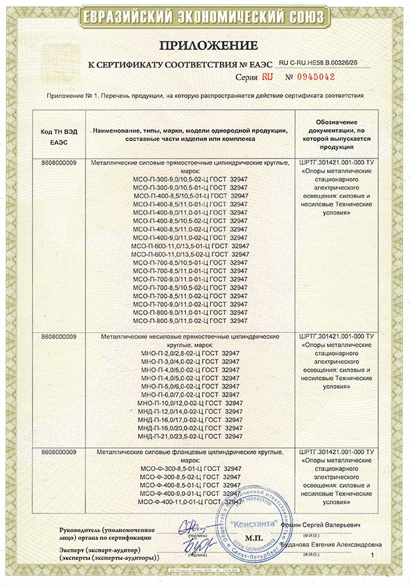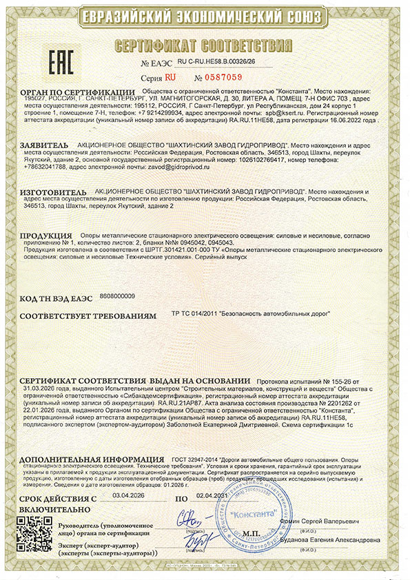 Опоры освещения нашего производства прошли сертификацию по ТР ТС 014/2011